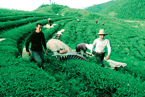 5月5日,江西省婺源縣大鄣山茶紫陽鎮(zhèn)考水茶葉基地的茶農(nóng)正忙著用機械采摘夏茶。眼下正值江西省婺源縣夏茶采摘的季節(jié),現(xiàn)代化的采茶機在茶園里忙碌地來回作業(yè)。婺源縣是“中國綠茶之鄉(xiāng)”,茶葉種植面積達16.8萬畝。婺源綠茶產(chǎn)品獲得6個AA級綠色食品認證、11個有機食品認證,5.2萬畝有機茶基地連續(xù)14年通過國際國內(nèi)檢測機構檢測頒證,有機茶出口從開始的5噸到現(xiàn)在的3100噸,增長了620倍。國外市場從德國拓展到整個歐盟,并已開拓至美國、日本等國家。