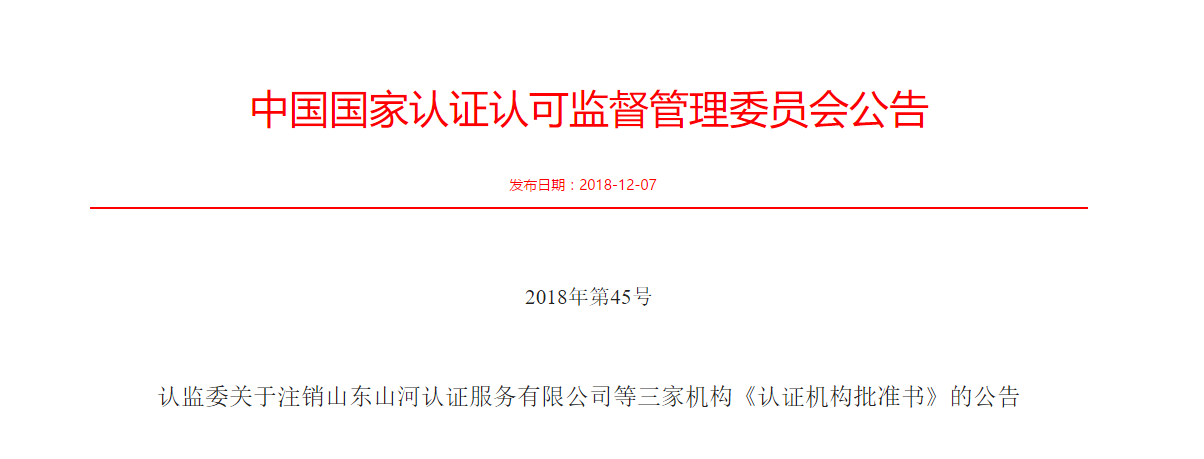 認(rèn)監(jiān)委關(guān)于注銷(xiāo)山東山河認(rèn)證服務(wù)有限公司