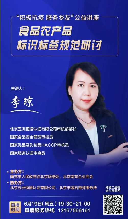 突如其來的新冠肺炎疫情,對全球食品供應(yīng)產(chǎn)生一些列負(fù)面影響,我國在積極落實疫情防控的同時,采取應(yīng)急響應(yīng),并高度重視民生問題,開展“保價格、保質(zhì)量、保供應(yīng)”行動。2020年6月19日,五洲恒通受主辦方南充市人民政府駐北京聯(lián)絡(luò)處、北京南充企業(yè)商會邀請,以“食品農(nóng)產(chǎn)品標(biāo)識標(biāo)簽規(guī)范”為主題開展“積極抗疫 服務(wù)鄉(xiāng)友”公益講座,助力生產(chǎn)企業(yè)復(fù)工復(fù)產(chǎn),幫助消費者更好選擇食品、農(nóng)產(chǎn)品。本次活動由北京五洲恒通認(rèn)證有限公司、北京市藍(lán)石律師事務(wù)所協(xié)辦,共計5280余人次參加直播講座。
