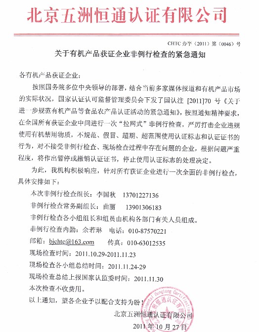 關(guān)于有機產(chǎn)品獲證企業(yè)非例行檢查的緊急通知
