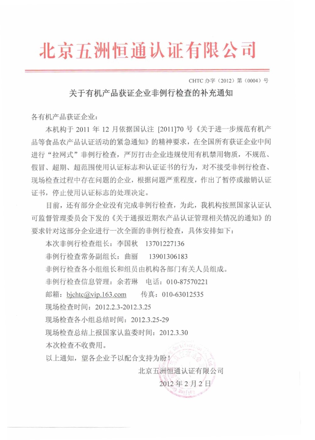 關(guān)于有機(jī)產(chǎn)品獲證企業(yè)非例行檢查的補(bǔ)充通知