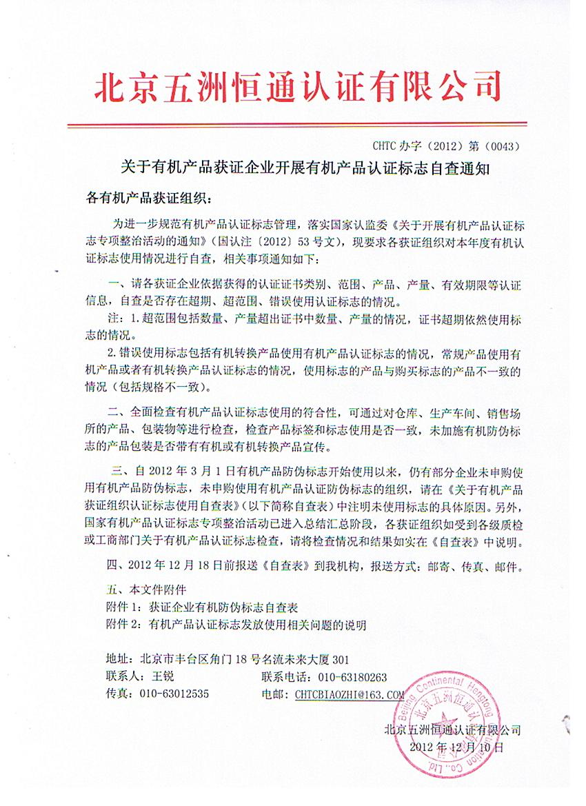 關于有機產(chǎn)品獲證企業(yè)開展有機產(chǎn)品認證標志自查通知