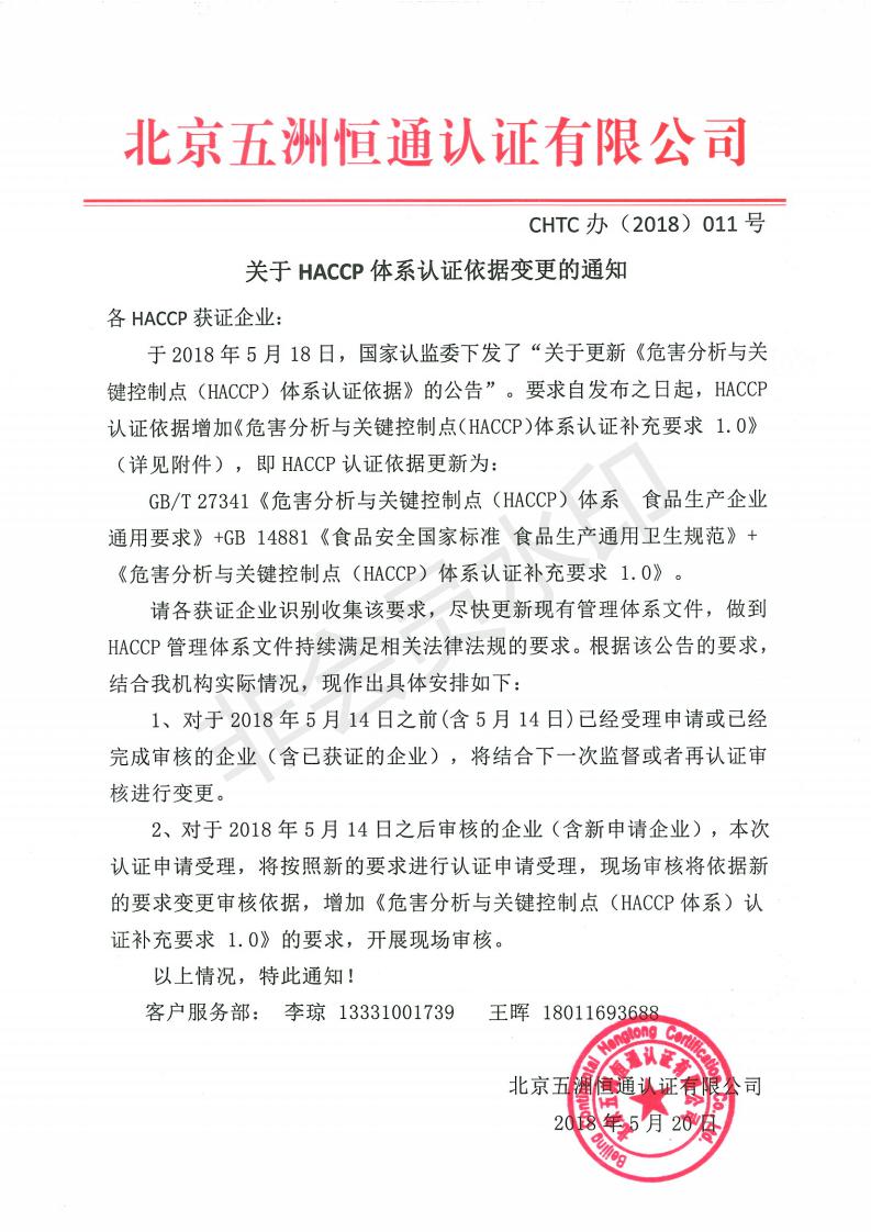 關(guān)于HACCP體系認證依據(jù)變更的通知