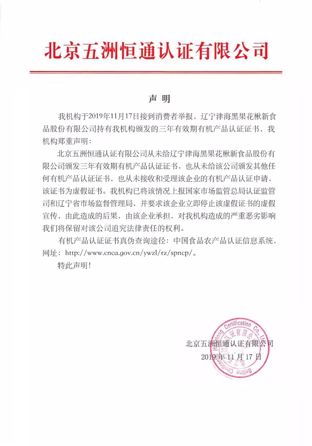 關(guān)于遼寧津海黑果花楸新食品股份有限公司虛假有機(jī)產(chǎn)品認(rèn)證證書(shū)的聲明