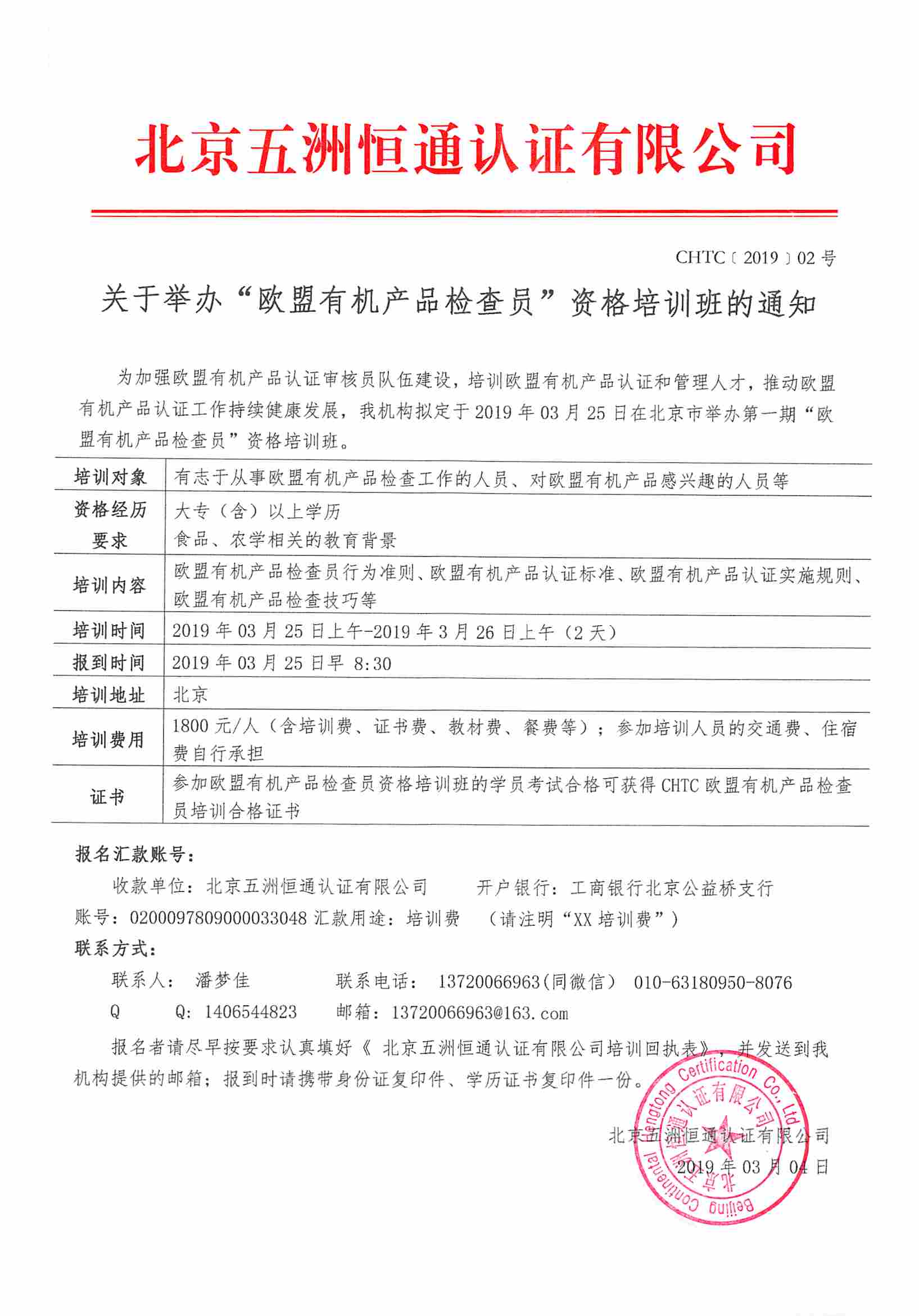 為加強歐盟有機產(chǎn)品認證審核員隊伍建設(shè),培訓(xùn)歐盟有機產(chǎn)品認證和管理人才,推動歐盟有機產(chǎn)品認證工作持續(xù)健康發(fā)展,我機構(gòu)擬定于2019年03月25日在北京市舉辦第一期“歐盟有機產(chǎn)品檢查員”資格培訓(xùn)班。