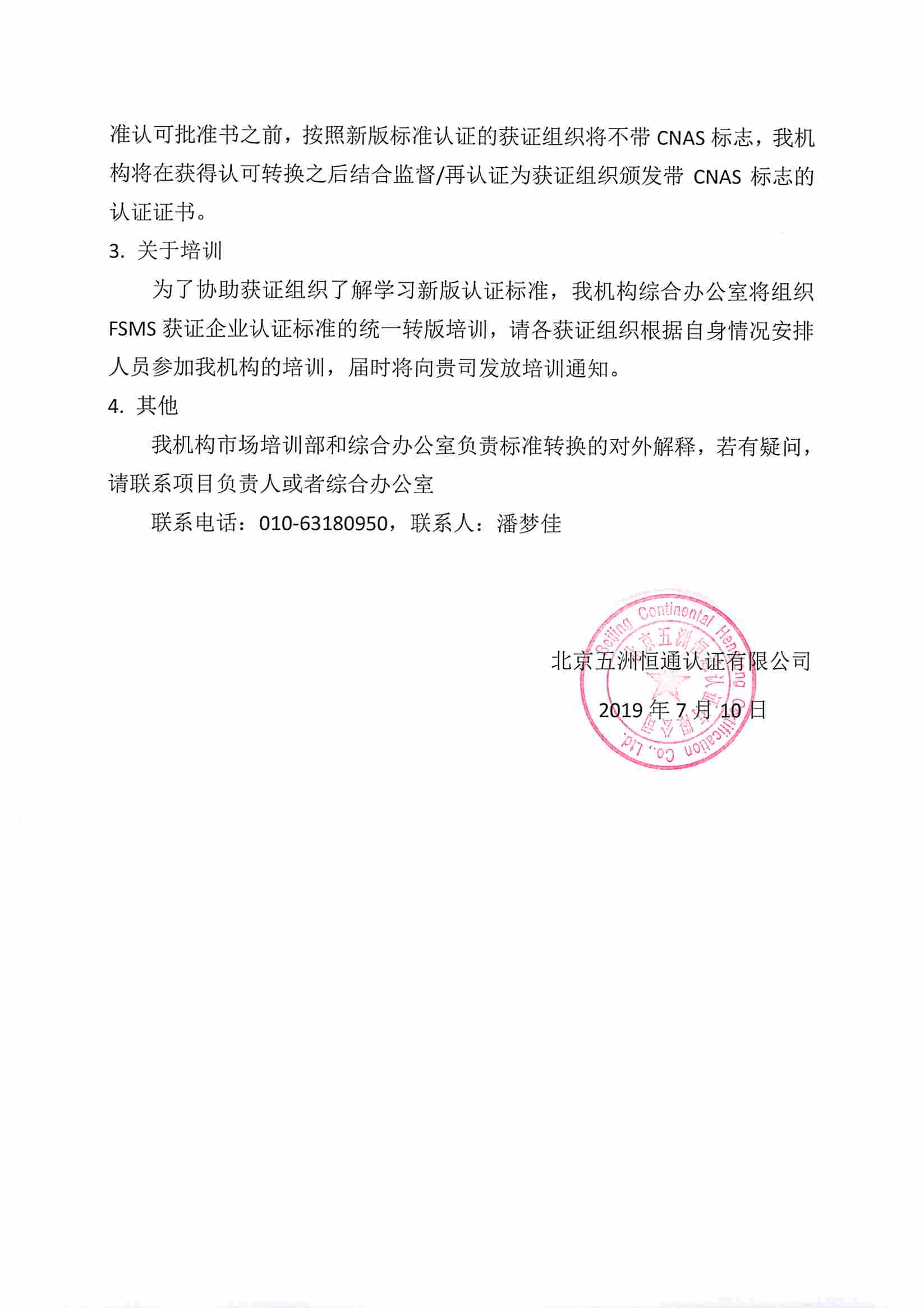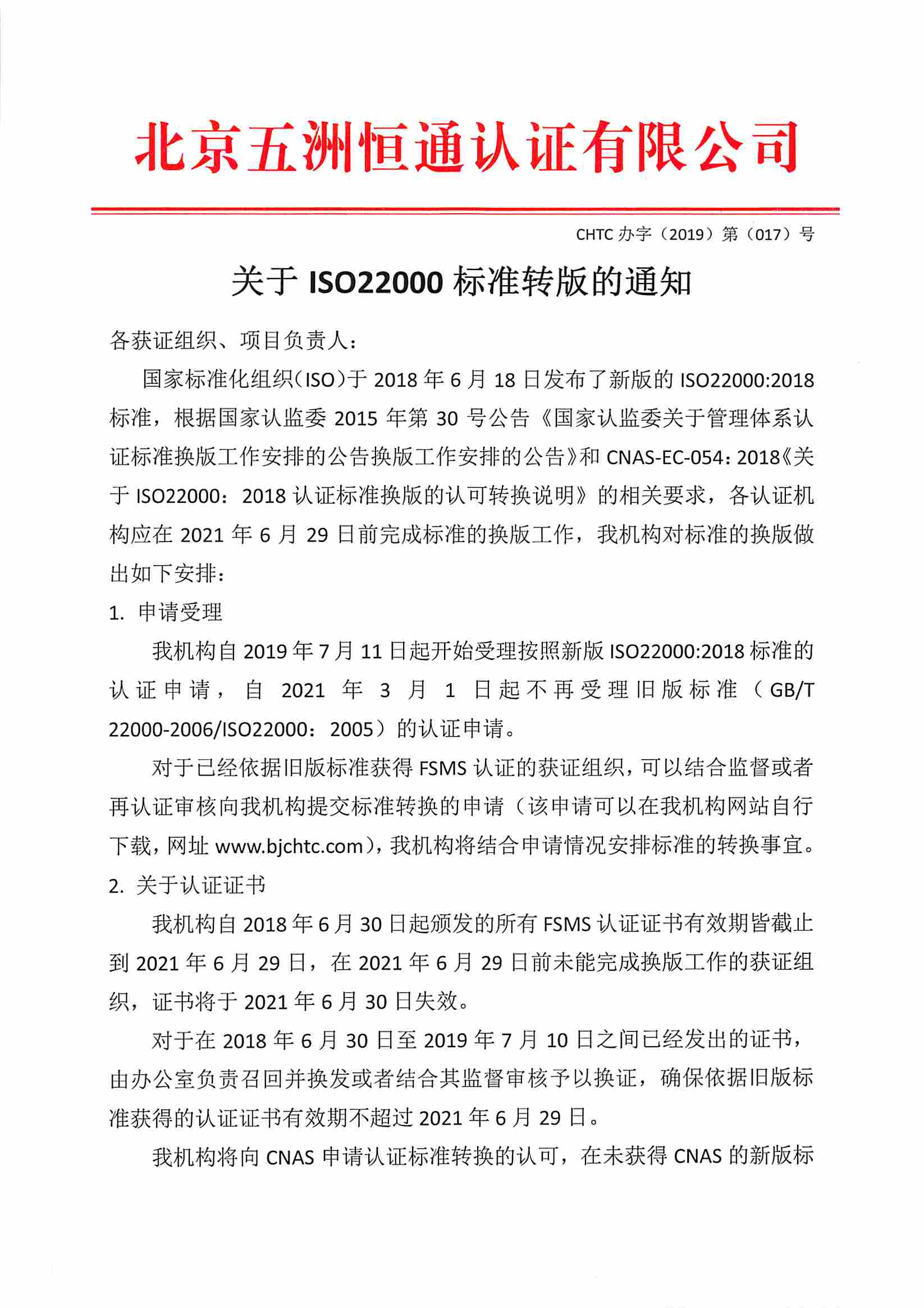 關(guān)于ISO 22000標(biāo)準(zhǔn)轉(zhuǎn)版的通知